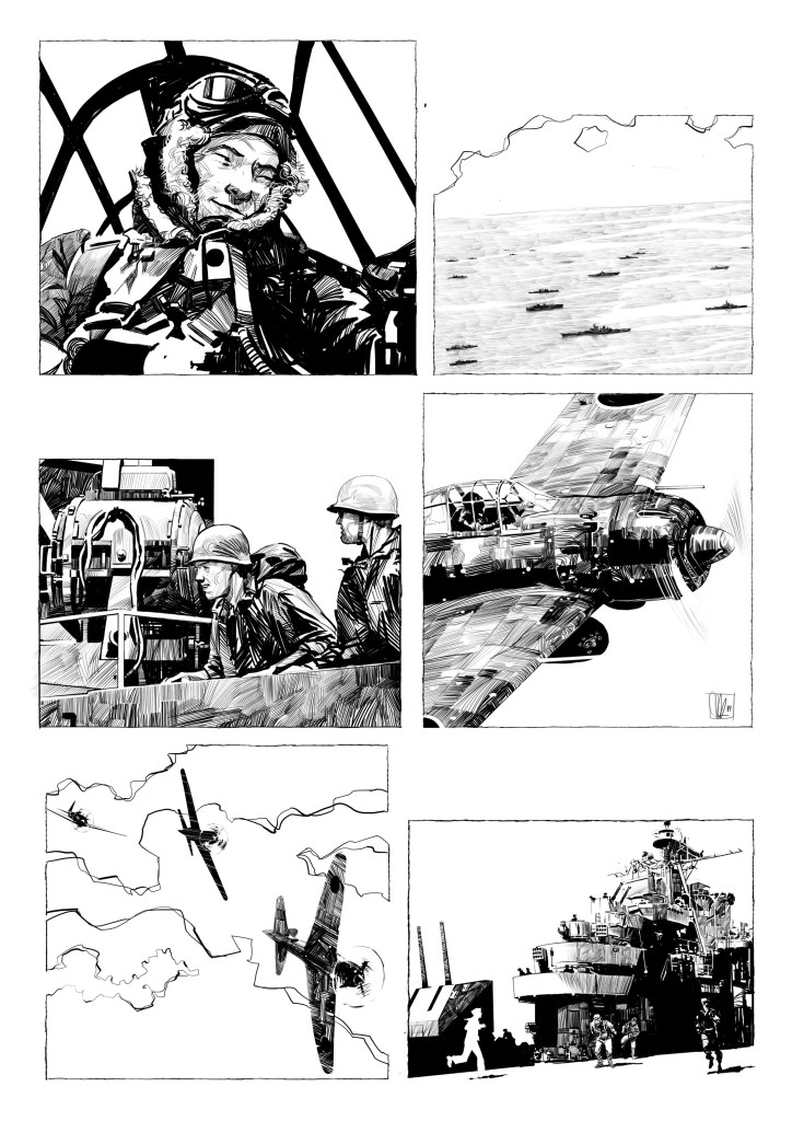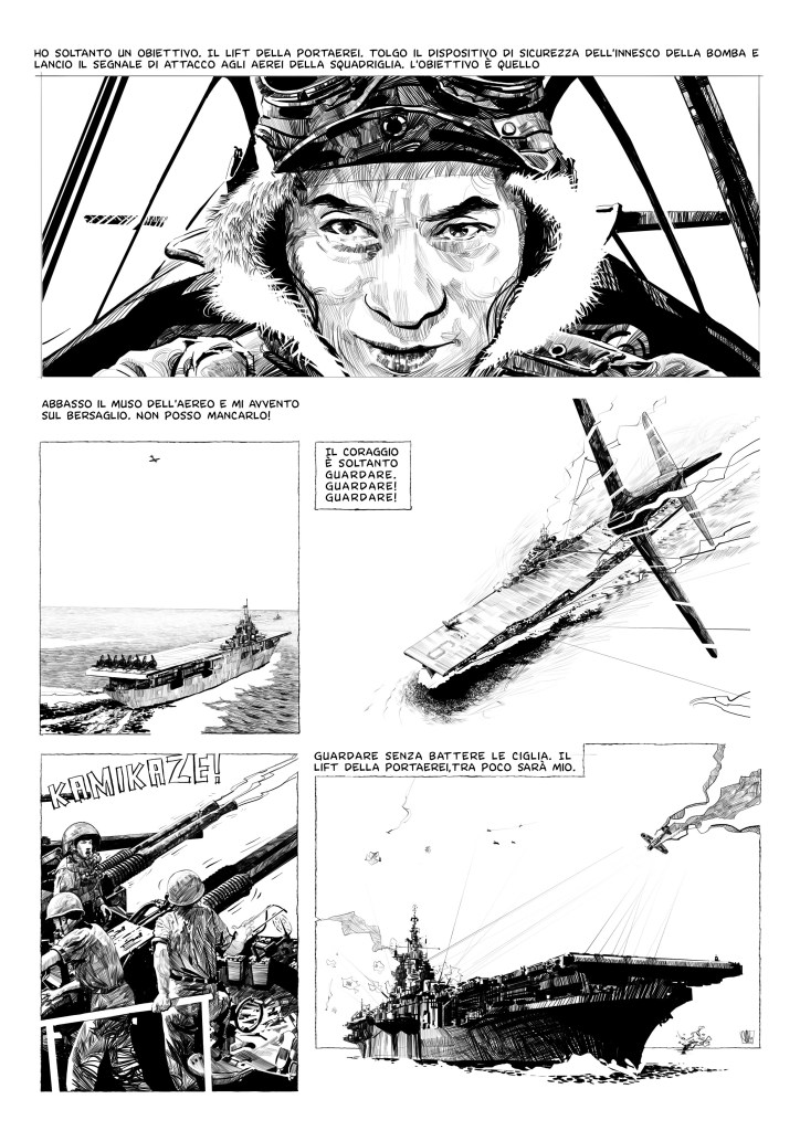 Questa breve e lunghissima storia ci porta a Mishima, biografia a fumetti dello scrittore giapponese per l’editore Ferrogallico. Casa editrice dichiaratamente di destra impegnata nel conquistare terreno nel mondo del fumetto che in Italia è monopolio della cultura di sinistra. L’argomento mi piace, conoscevo e ammiravo Yukio Mishima, mi ricordavo del doloroso esordio con gli amati Stones, volevo rimediare e risistemare le lancette del tempo! Accetto. La sceneggiatura non è veramente tale, non è indicato nemmeno il numero di pagine definitivo, alcune parti sono prolisse, altre si risolvono in: “Qualche pagina con scene di kamikaze”. Ma l’autore del testo non si opporrà mai alla mia revisione e alla riduzione in 75 pagine quindi posso finalmente lavorare sereno anche se i tempi di consegna si dilatano per il lavoro imprevisto di riadattamento della sceneggiatura. Il 20 ottobre 2019 il libro arriva alle vendite e sembra essere stato accolto con favore. Per i limiti che il mercato nazionale mette in termini di compensi il lavoro è soddisfacente e finalmente mi sento di affermare 40 anni dopo, di aver esordito come fumettista! Basta aver pazienza e crederci….
